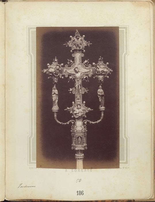 Riproduzione fotografica di una croce astile appartenente al Tesoro del Duomo di Pordenone. La croce processionale è in argento, con il Cristo al centro, i quattro simboli degli evangelisti nei lobi della croce, la Vergine e San Giovanni evangelista (figure che accompagnano tipicamente l'iconografia della Crocifissione), scolpite a tutto tondo, sono su bracci lavorati che sporgono dalla base della croce. Il verso della croce è riprodotto nell'immagine successiva in album (ID 847)