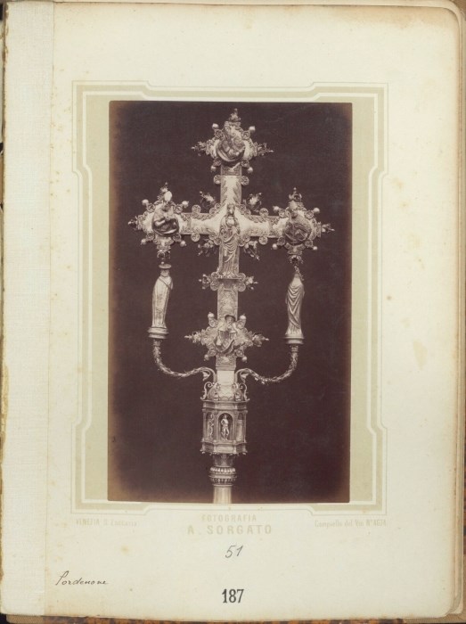 Riproduzione fotografica di una croce astile appartenente al Tesoro del Duomo di Pordenone. La croce processionale è in argento, con la Vergine incoronata al centro e quattro dottori della Chiesa nei lobi della croce; la Vergine e San Giovanni evangelista (figure che accompagnano tipicamente l'iconografia della Crocifissione), scolpite a tutto tondo, qui visibili di spalle, sono su bracci lavorati che sporgono dalla base della croce. Il fronte della croce è riprodotto nell'immagine successiva in album (ID 846)