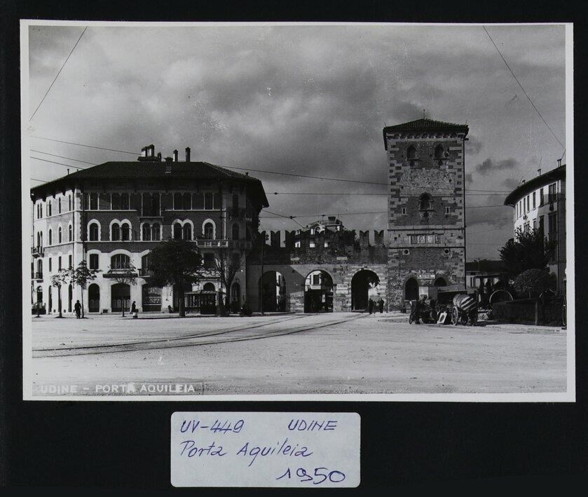 Udine, piazzale Gabriele D'Annunzio: veduta di Porta Aquileia (metà del Trecento), quinta cerchia muraria. In basso a sinistra, didascalia a caratteri stampati "UDINE - PORTA AQUILEIA".