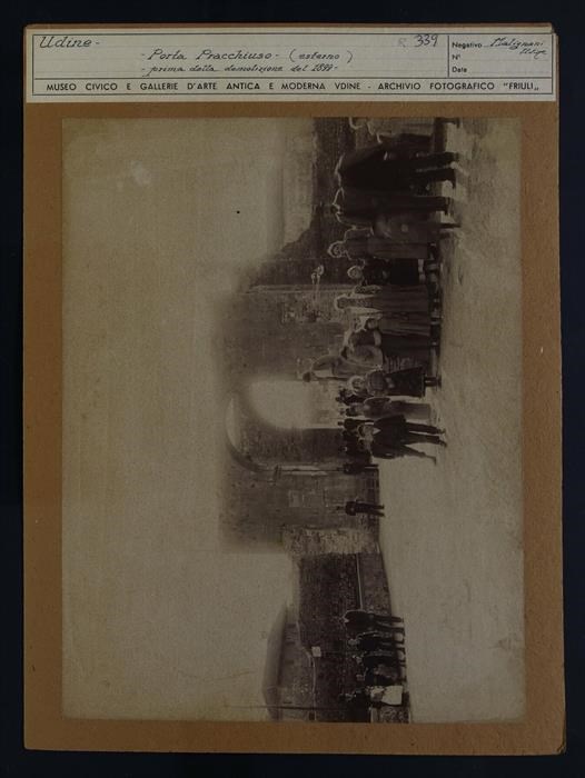 Udine: porta Pracchiuso, quinta cerchia muraria (costruita tra XIV e XV secolo). La torre viene demolita nel 1846 e nel 1899 vengono demoliti gli archi, qui ancora visibili. Diverse persone, tra cui bambini e alcuni uomini in divisa, sono in posa. Un gruppo di sei persone è collocato a sinistra.