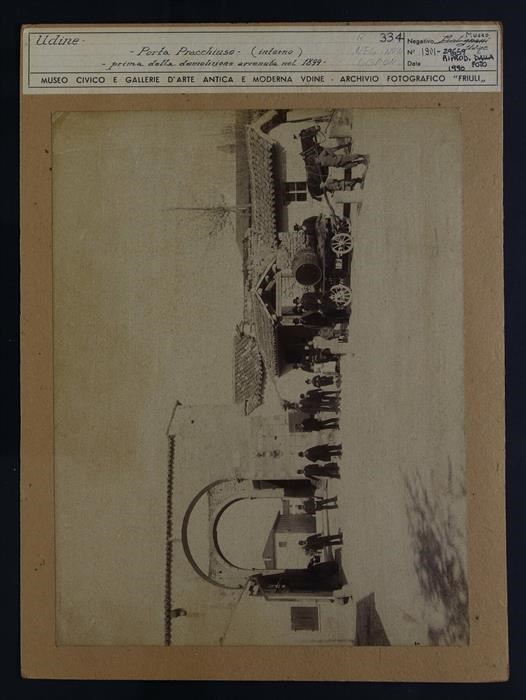 Udine: porta Pracchiuso, quinta cerchia muraria (costruita tra XIV e XV secolo). La torre viene demolita nel 1846 e nel 1899 vengono demoliti gli archi, qui ancora visibili. Ventuno persone, tra cui una donna e alcuni uomini in divisa, sono in posa. A destra, un cavallo e un carro con una botte. La fotografia è stata usata come cartolina.