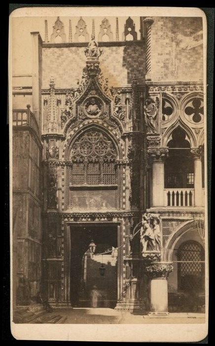 Vista della porta principale di palazzo Ducale, della facciata e della scala interna corrispondente.