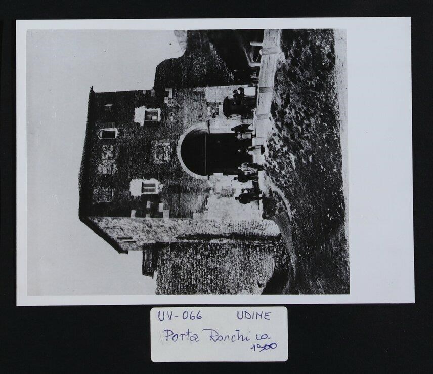 Udine: porta Ronchi, quinta cerchia muraria (XIV-XV secolo). Dodici persone, di cui alcuni uomini in divisa, sono in posa davanti alla porta.