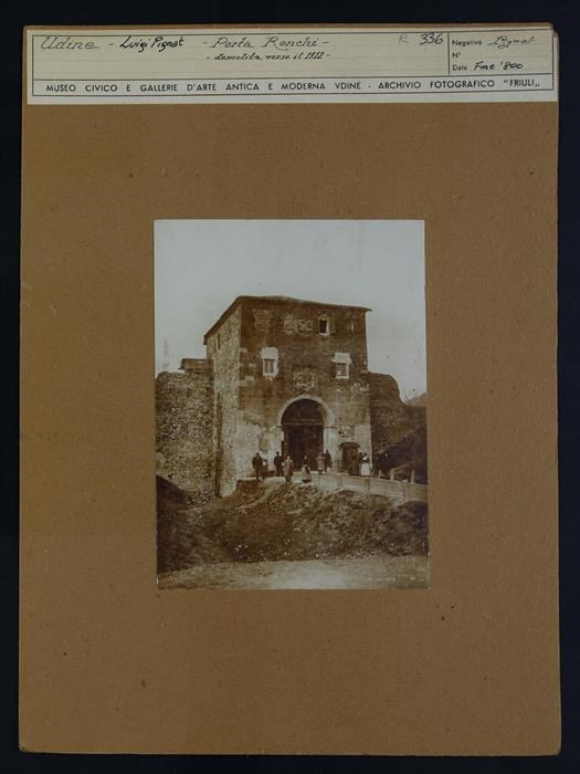 Udine: porta Ronchi, quinta cerchia muraria (costruita tra XIV e XV secolo). Dodici persone, di cui alcuni uomini in divisa, sono in posa davanti alla porta.