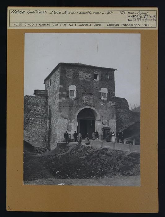 Udine: porta Ronchi, quinta cerchia muraria (costruita tra XIV e XV secolo). Dodici persone, di cui alcuni uomini in divisa, sono in posa davanti alla porta.