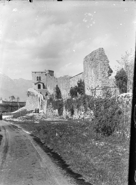 La Porta di San Giovanni a Venzone con ruderi della cinta muraria; alcune persone a passeggio ed altre sedute sulla scalinata che conduce alla Porta.