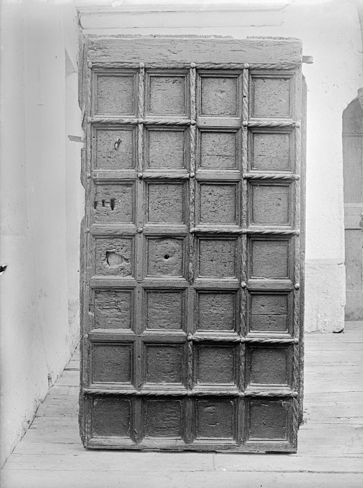 Un portale in legno suddiviso in quadrati spostato dalla sua posizione originaria per la documentazione fotografica.