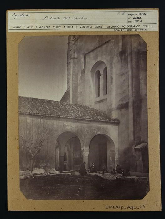 Aquileia: veduta dall'esterno del porticato e della facciata della basilica patriarcale di Santa Maria Assunta. A destra si noti la facciata a salienti con bifora centrale, preceduta dal portico voluto da Massenzio che collega la Chiesa dei Pagani con la basilica. In basso si colloca un gruppo di otto persone con abiti distinti sedute tra le lastre marmoree e le vestigia romane. Dietro, sotto il porticato, se ne intravede un'altra.