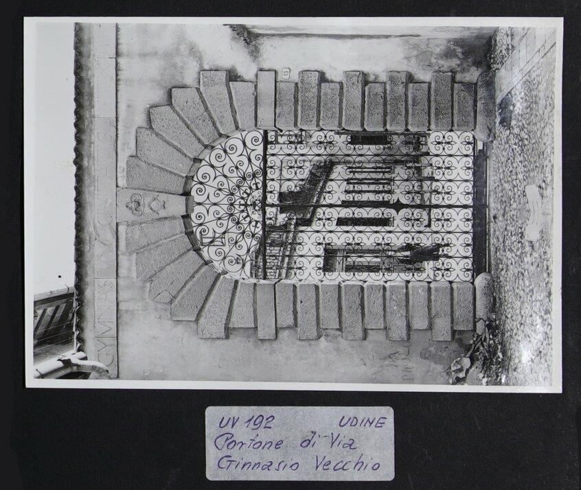 Udine, via Ginnasio Vecchio 13: portone di ingresso, con cancello (primi anni Ottanta del Seicento), all'ex collegio dei padri Barnabiti. L'arco a bugnato in pietra (1810) è opera dei Barnabiti, che fondarono le Scuole Classiche Udinesi tre anni prima. Sulla chiave di volta si trova lo stemma della città. L'iscrizione collocata sopra l'arco recita: GYMNASIVM CIVITATIS VTINI – MDCLXXIX (GINNASIO DELLA CITTÀ DI UDINE – 1679). In basso a sinistra, dietro il cancello, un ragazzo in posa.