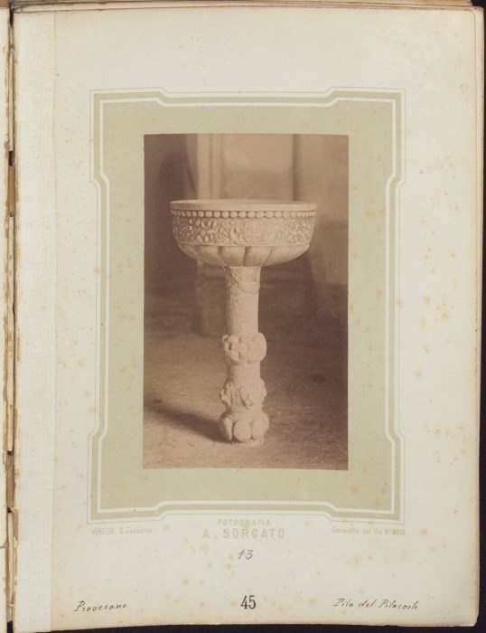 Acquasantiera, datata 1497, di Giovanni Antonio Pilacorte, presente nella Chiesa di San Leonardo, parrocchiale di Provesano, frazione di San Giorgio della Richinvelda, appartenente alla diocesi di Concordia-Pordenone. L’acquasantiera è a coppa costolata con protomi leonine alla base del fusto. Nell'immagine è leggibile, nella fascia decorata a racemi della coppa, lo stemma dei Spilimbergo.