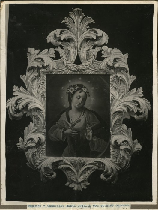 Riproduzione fotografica di un piccolo quadro dipinto raffigurante Santa Cecilia con una colomba inserito in una cornice lignea barocca conservata presso la Chiesa di San Martino Vescovo a Morsano al Tagliamento.