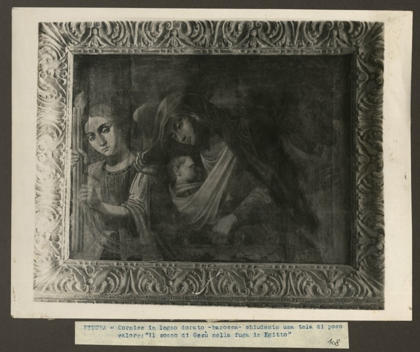 Riproduzione fotografica di un quadro in cornice lignea dorata e raffigurante "Il sonno di Gesù nella fuga in Egitto" conservato presso la Chiesa di San Giovanni Battista a Meduna di Livenza.