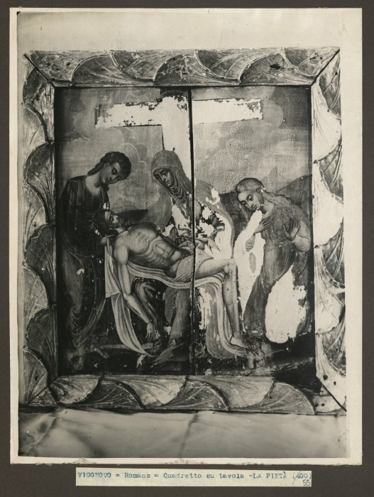 Riproduzione fotografica di un quadro su tavola, in cattivo stato conservativo, raffigurante "La Pietà" e conservato presso la Chiesa della Beata Vergine del Rosario nel borgo di Romano, nella frazione di Vigonovo di Fontanafredda.