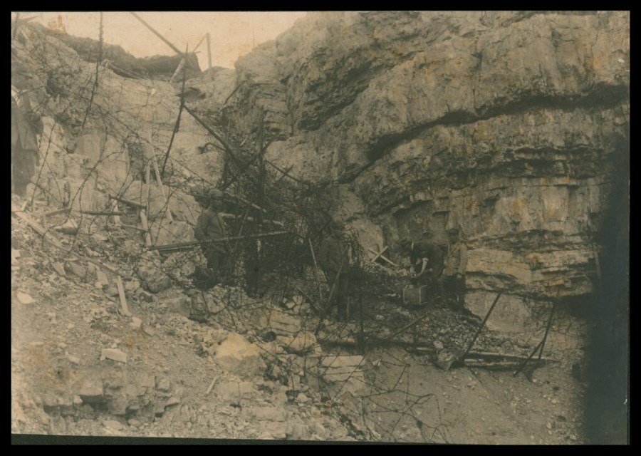 Gruppo di militari ritratto davanti ad una parete rocciosa in zona protetta da residui di filo spinato e materiale bellico; un militare sta raccogliendo i resti di salme di caduti; è visibile una croce in legno nei suoi pressi