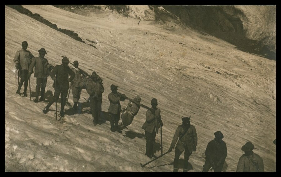 Militari, in fila indiana, sul ghiacciaio dell'Ortles, intenti al trasporto di salme di caduti della Prima Guerra mondiale.