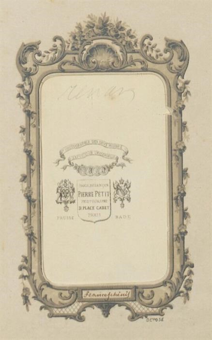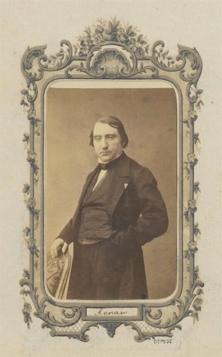 Ritratto in studio, in piedi accanto ad una sedia, di Ernest Renan (1823 - 1892), filosofo, filologo, storico delle religioni e scrittore francese. Famoso per la sua definizione di nazione data nel suo discorso "Che cos'è una nazione?", tenuto alla Sorbona nel 1882, ma anche per i suoi contributi in storia delle religioni, soprattutto in quanto autore della popolare "Vie de Jésus" (Vita di Gesù), pubblicato nel 1863, primo volume di un progetto più ampio, la "Storia delle origini del cristianesimo" (otto volumi pubblicati tra il 1863 e il 1883). Renan, filologo e storico, adottando un punto di vista risolutamente positivista, presentò Gesù Cristo come un'alta personalità morale, rifiutando la sua divinità e ogni intervento del soprannaturale.