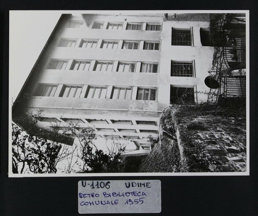 Udine, piazza Guglielmo Marconi: retro di Palazzo Dragoni-Bartolini, sede della Biblioteca Civica "Vincenzo Joppi" dal 1866.