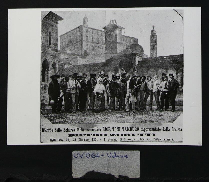 Udine: ritratto di gruppo di attori teatrali e veduta di piazza Libertà nel manifesto della rappresentazione "Sior Toni Tamburo" della Società "Pietro Zorutti" di Udine nei giorni 30, 31 dicembre 1871 e 1° gennaio 1872 al Teatro Minerva (che accoglieva spettacoli circensi), demolito nel 1926. In primo piano a destra, la Loggia di San Giovanni, in cui si innesta la Torre dell'Orologio, di Giovanni da Udine (1527). In primo piano a sinistra, la Loggia del Lionello, finita di costruire per volere di Nicolò Lionello. In secondo piano a sinistra, il castello e, a destra, il campanile della chiesa di Santa Maria di Castello.