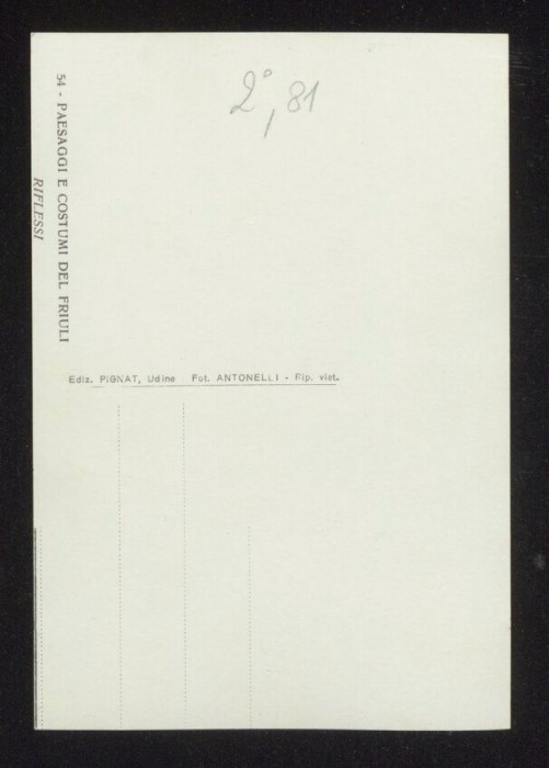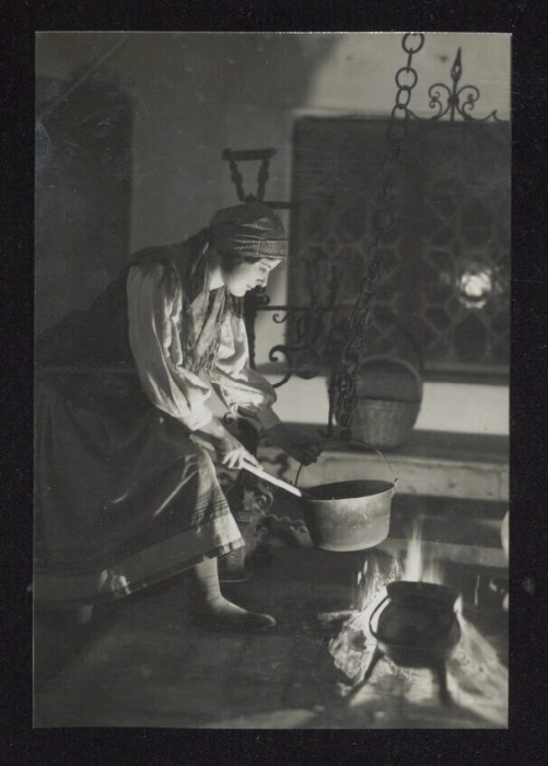 Lo scatto di Umberto Antonelli, farmacista e fotografo attivo in Carnia tra 1909 e 1949, è parte della serie di cartoline pubblicate dal fotografo editore Carlo Pignat con il titolo "Paesaggi e Costumi del Friuli" nella seconda metà degli anni Trenta del Novecento, raffiguranti tutte una Carnia e un Friuli arcadici. L'immagine ritrae la modella Aurelia Frucco con il costume tradizionale carnico, all'interno della casa detta "das Toscjanas" a Enemonzo (edificio demolito dopo il terremoto del 1976), mentre gira la polenta nel paiolo appeso nel "fogolar".