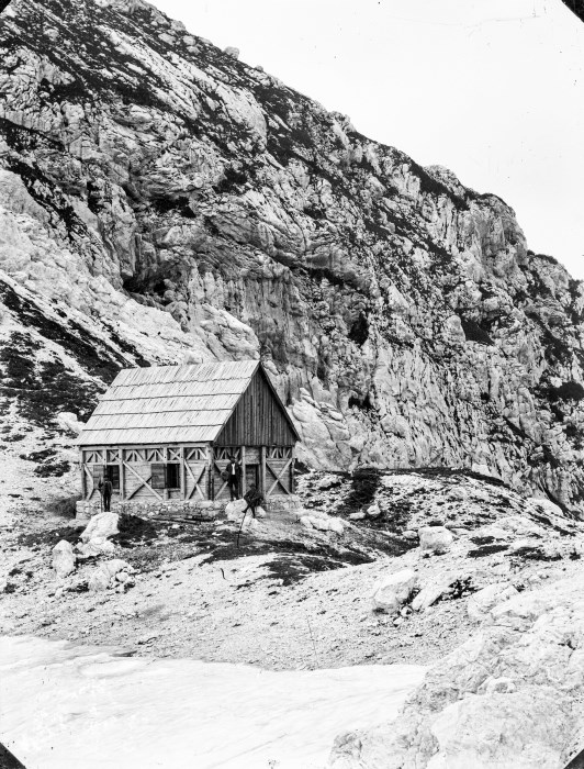 Veduta di un rifugio in legno incastonato fra le montagne: a sinistra una parte di un ghiacciaio, all'esterno del rifugio due uomini e un ragazzino in posa per lo scatto.