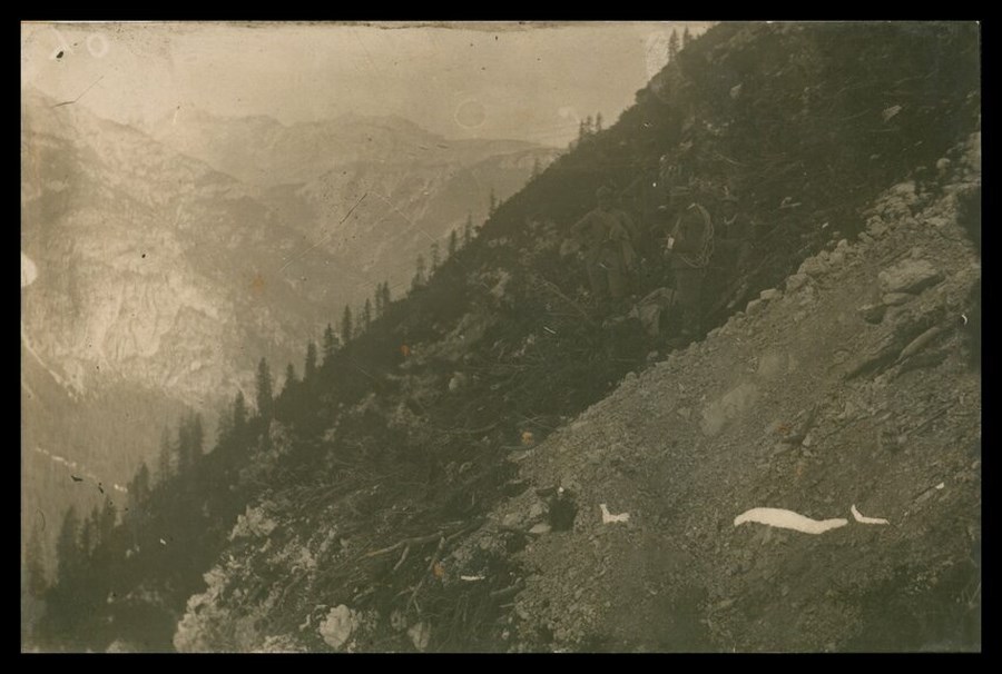 Tre soldati intenti nel recupero delle salme di guerra, in zona montana