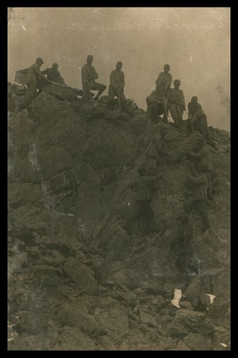 Gruppo di militari intento ad issare, con l'aiuto di funi, salme di caduti della Grande Guerra dal fondo di un burrone, verso la sommità della costa rocciosa.