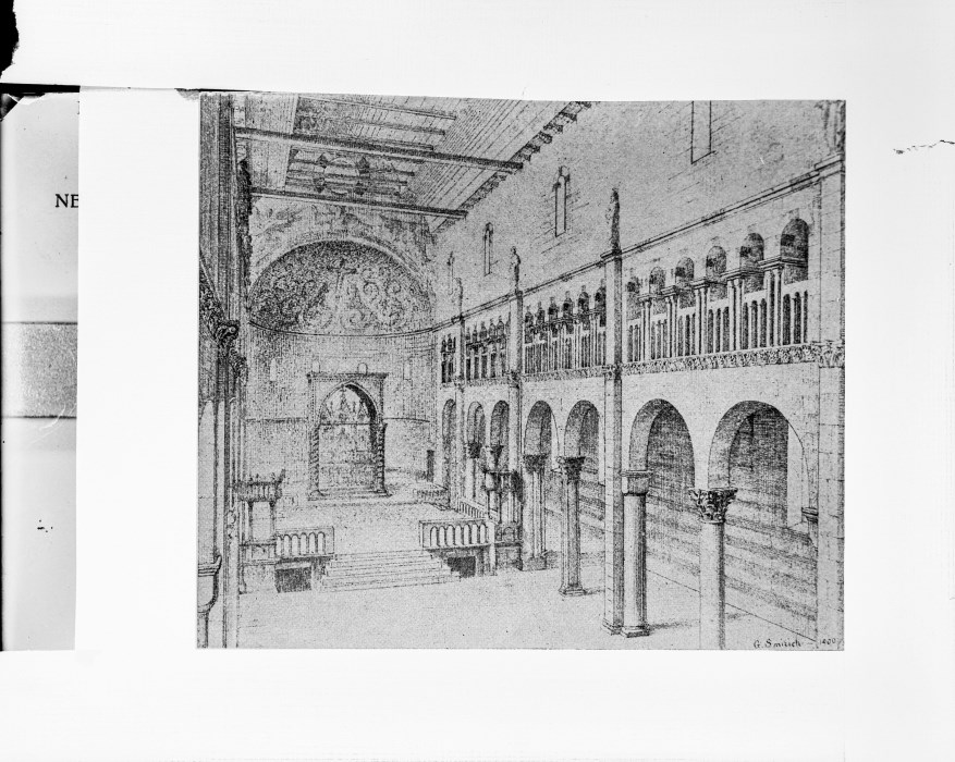 Riproduzione fotografica di una stampa con disegno dell'interno di una chiesa.