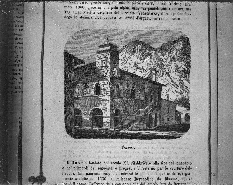 Riproduzione fotografica della porzione di un testo riguardante Venzone e, nello specifico è presente l'incisione che raffigura il Palazzo Comunale di Venzone.