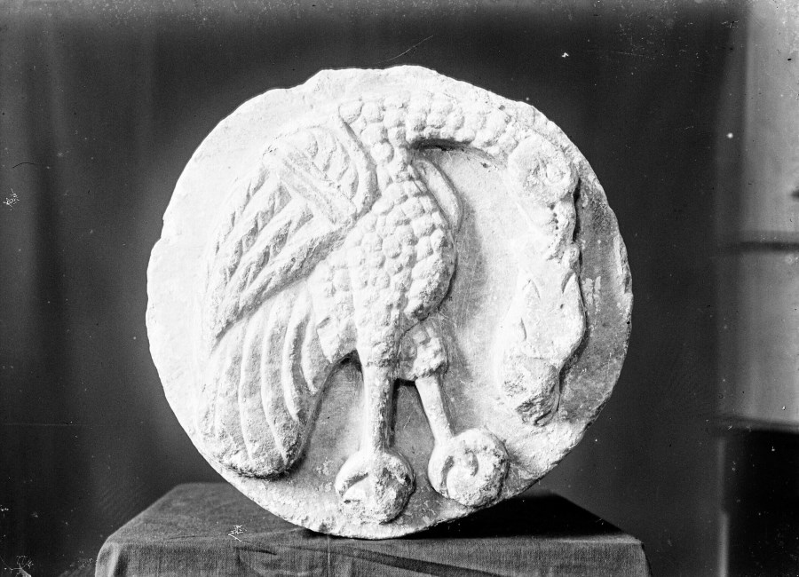 Riproduzione fotografica di un bassorilievo su pietra tondeggiante di un uccello con una preda nel becco.