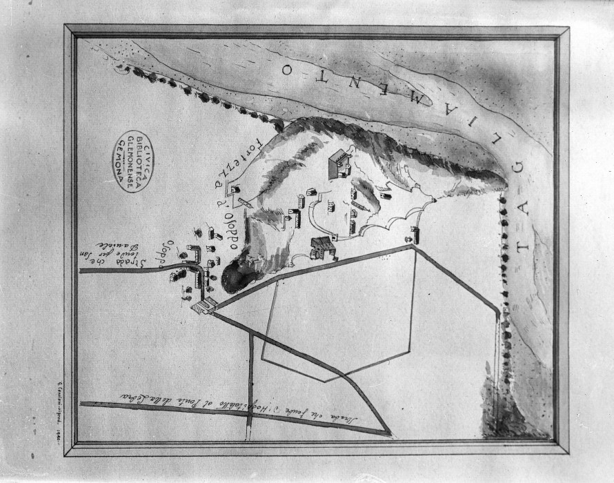 Riproduzione fotografica di un disegno a inchiostro e acquerello della fortezza di Osoppo, del medesimo paese e del fiume Tagliamento. E' visibile un timbro a inchiostro della "Biblioteca Civica Glemonense" di Gemona.