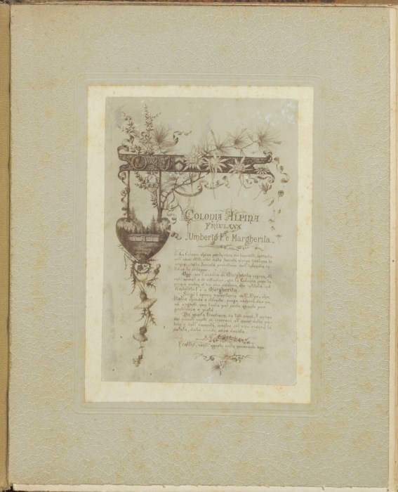 Riproduzione fotografica di un documento manoscritto riferito all'intitolazione della Colonia Alpina Friulana di Frattis di Pontebba al Re di Savoia Umberto I e la regina Margherita nel 20 agosto 1901. La suddetta colonia fu istituita nel 1893 come ente per la cura dei bambini voluta già dalla Società alpina Friulana e dalla Società protettrice dell'infanzia di Udine.