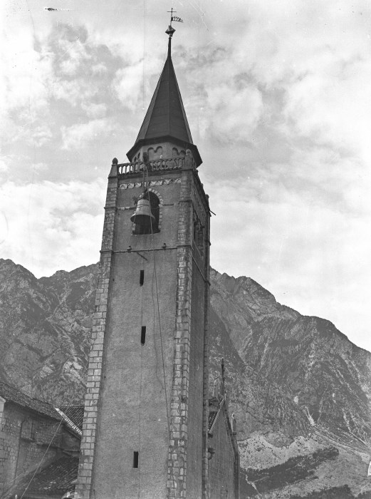 Lavori di ristrutturazione del campanile del Duomo di Venzone: veduta del momento in cui viene portata nella cella campanaria una della quattro campane.
