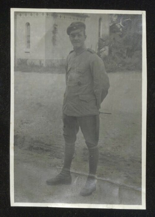 Ritratto a figura intera di un soldato nel cortile di un edificio.