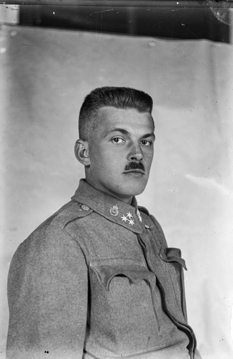 Ritratto a mezzobusto di un soldato; dietro a lui un probabile fondale come set fotografico.