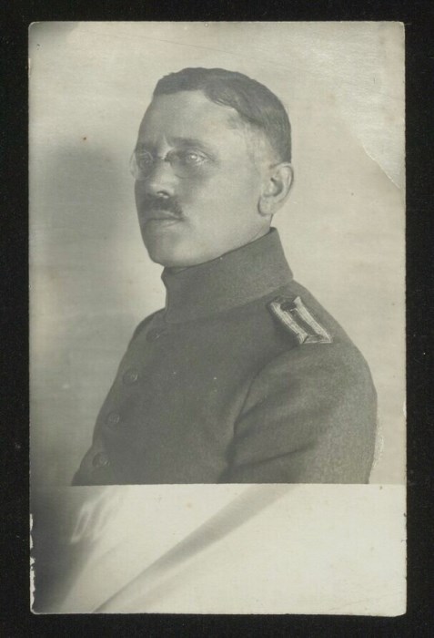 Ritratto a mezzobusto di un soldato con occhiali su fondo chiaro.