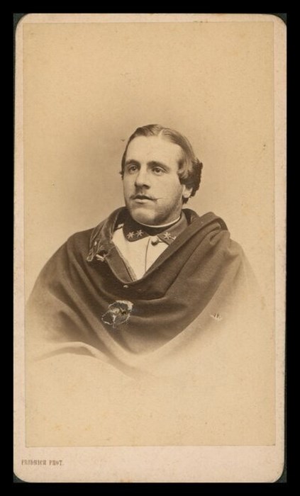 Ritratto a mezzobusto in studio di un uomo in divisa e mantello sulle spalle.