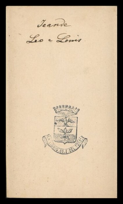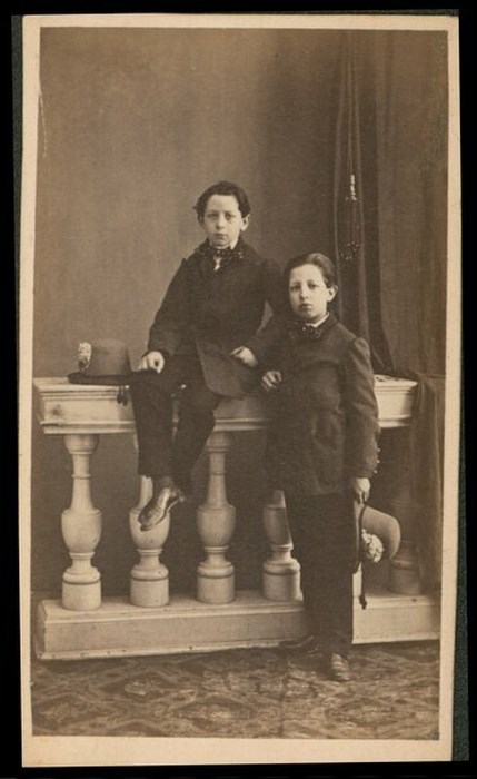 Ritratto in studio a figura intera dei fratelli Leo e Louis Jeanve: i due bambini sono vestiti allo stesso modo; uno dei due è seduto sopra un balaustra scenografica.