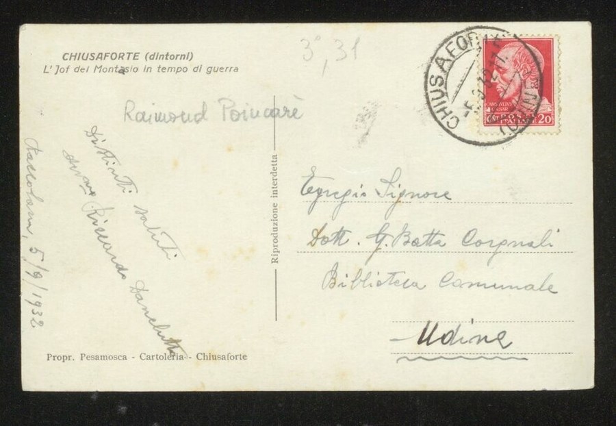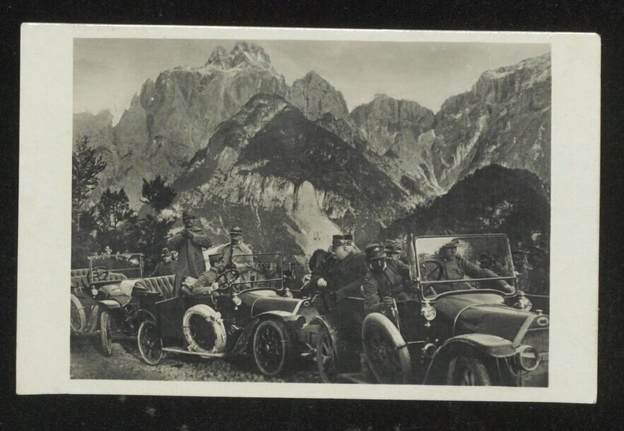 Ritratto del Presidente francese Raymond Poincaré, seduto e di profilo sulla prima automobile, assieme ad altri ufficiali e soldati. Le automobili sono posteggiate su di una strada sterrata a Chiusaforte; sullo sfondo una splendida veduta dello Jôf di Montasio.