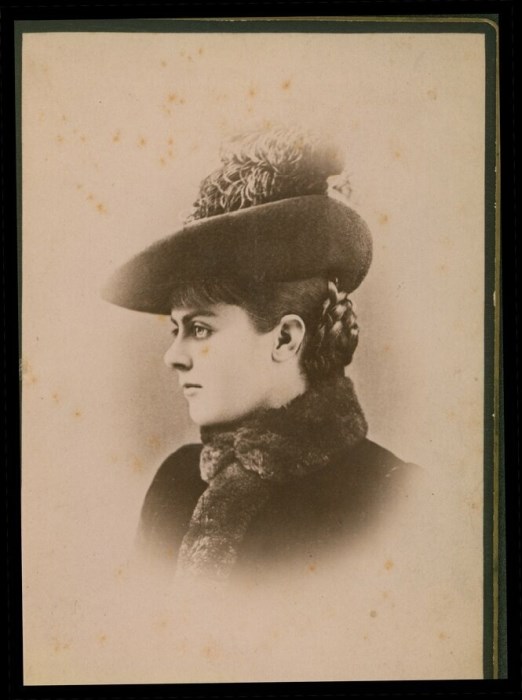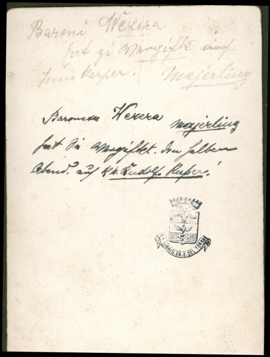 Ritratto a mezzo busto e di profilo della baronessa Marie Alexandrine von Vetsera (Vienna, 19 marzo 1871 – Mayerling, 30 gennaio 1889), nota in Italia come Maria Vetsera, nobildonna austriaca, celebre amante dell'arciduca Rodolfo d'Asburgo-Lorena, erede al trono d'Austria-Ungheria. Maria e Rodolfo furono trovati morti la mattina del 30 gennaio 1889 nella tenuta di caccia di Mayerling, nella Bassa Austria. Tutto fa pensare a un caso di omicidio-suicidio: la versione ancora oggi più accreditata è che Rodolfo sparò alla tempia della giovane, appena diciottenne, Vetsera, pienamente consenziente, e poi rivolse l'arma contro di sé dopo aver scritto alcune lettere d'addio ai suoi familiari.