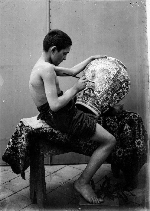 Ritratto di un bambino a cavalcioni su una panca con coperta decorata, in posa mentre finge di dipingere un vaso; la fotografia propone una posa che ricorda i dipinti neoclassici o le fotografie di Wilhelm von Gloeden con costumi ispirati all'antica Grecia.