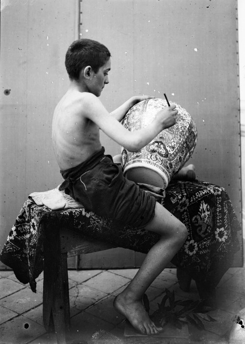 Ritratto di un bambino a cavalcioni su una panca con coperta decorata, in posa mentre finge di dipingere un vaso; la fotografia propone una posa che ricorda i dipinti neoclassici o le fotografie di Wilhelm von Gloeden con costumi ispirati all'antica Grecia.