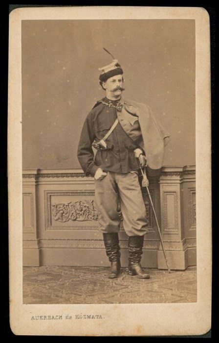 Ritratto in studio a figura intera dell'ufficiale Carl Komorowsky in divisa e spada appoggiato ad un muro decorato dello studio fotografico.