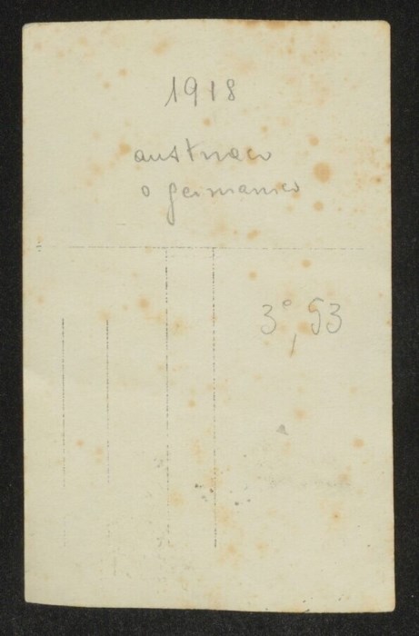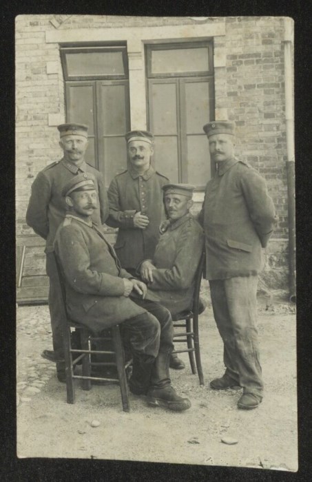 Ritratto di cinque soldati, due seduti su sedie e tre in piedi, in posa per lo scatto della fotografia nel cortile di un edificio.