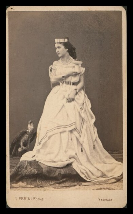 Ritratto a figura intera di donna con diadema e aquila impagliata.