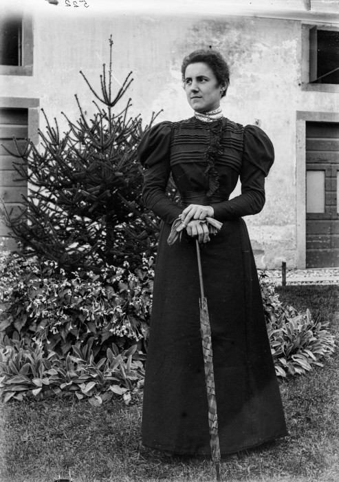 Ritratto di una donna in abito scuro con ombrello ed in posa nel giardino di un edificio.