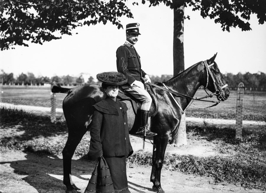 Ritratto di una nobildonna in abiti scuri e con cappello in piedi vicino ad un soldato a cavallo su di una strada sterrata.