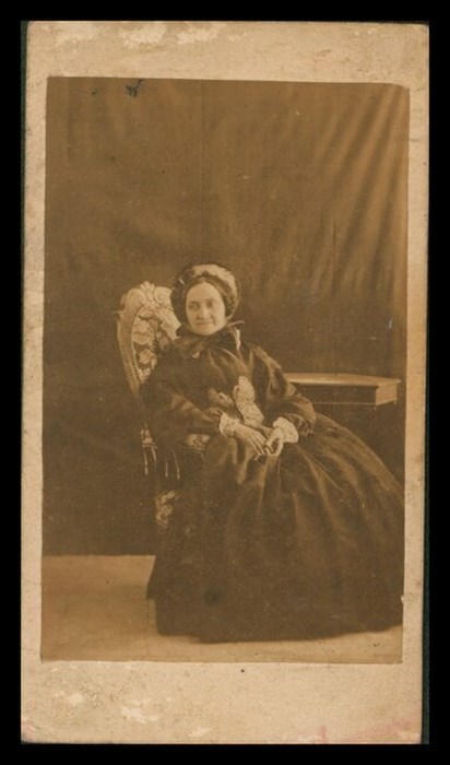 Ritratto di donna, in studio, seduta con ampio vestito e cuffietta