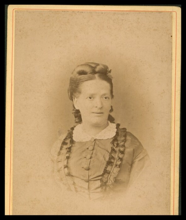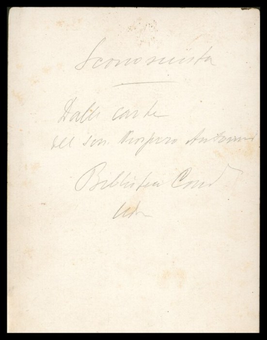 Ritratto in studio a mezzobusto di una nobil donna con abito scuro e colletto bianco e acconciatura ottocenteschi.