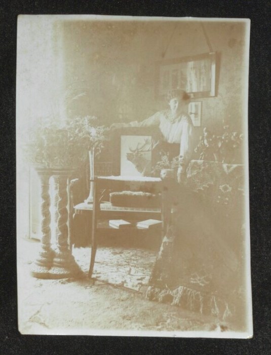 Ritratto di una donna all'interno di un soggiorno appoggiata ad un tavolo con oggetti di arredo. Probabilmente è la compagna di un ufficiale di stanza a Udine durante l'occupazione tedesco austro-ungarica in Friuli nel primo conflitto mondiale.