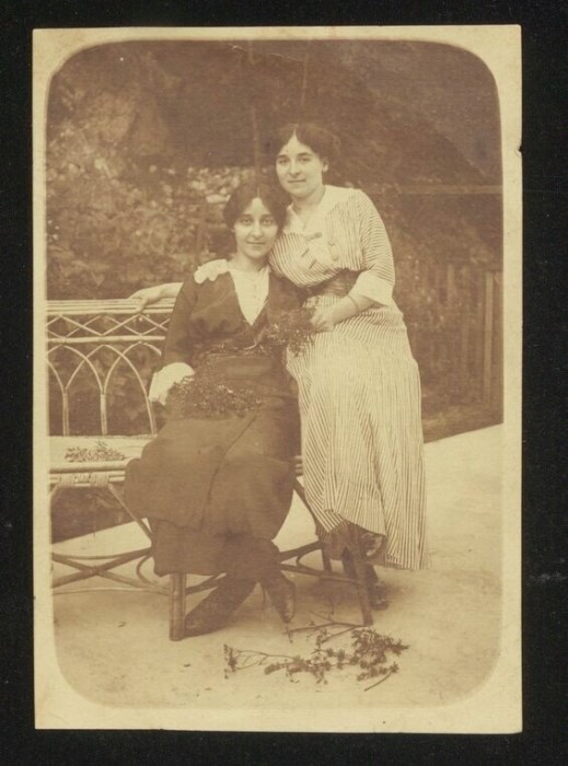 Due donne, probabilmente le compagne di alcuni ufficiali, ritratte sedute in una sedia di vimini in un giardino.